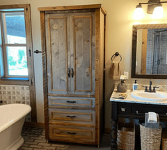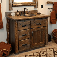 Complete your bathroom with the natural beauty and durability of handcrafted rustic bathroom furniture. Our collection includes solid wood vanities, linen closets, medicine cabinets, mirrors, and over-the-toilet storage—each piece designed to bring warmth, charm, and functionality to your space. Built from reclaimed barnwood or Northern White Cedar, these rugged yet refined pieces offer smart storage solutions while adding timeless character to your bathroom. Whether you're outfitting a cozy cabin or elevating a modern rustic retreat, our rustic bathroom furniture is made to last—and made in the USA.